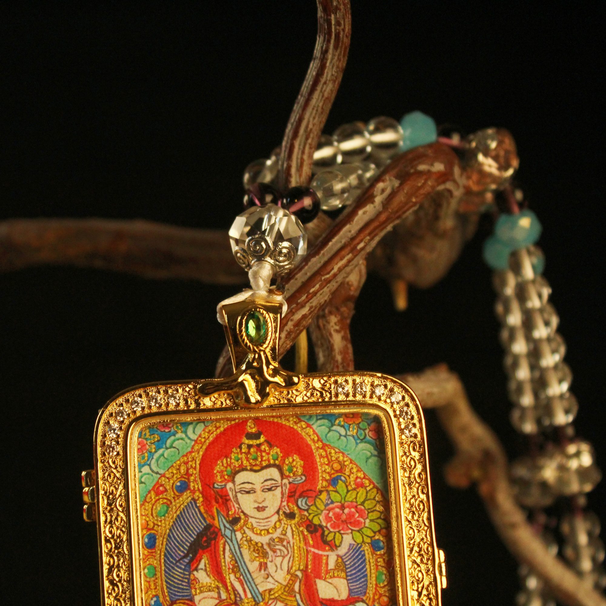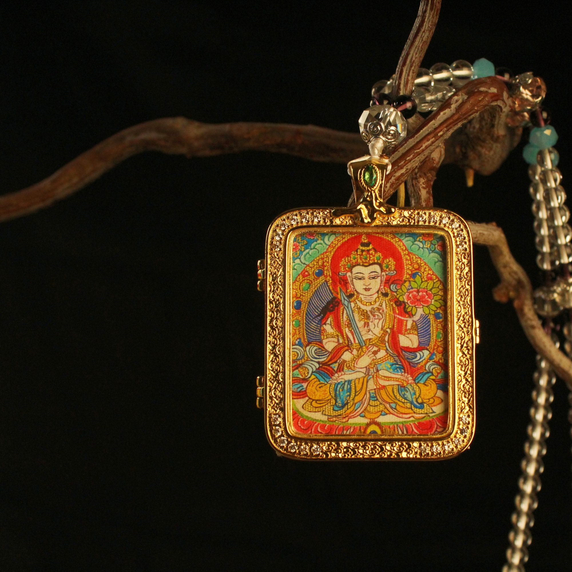 The “Sword of Wisdom”: Manjushri Thangka Locket | Gold & Crystal Gau Box (Intellect & Clarity)