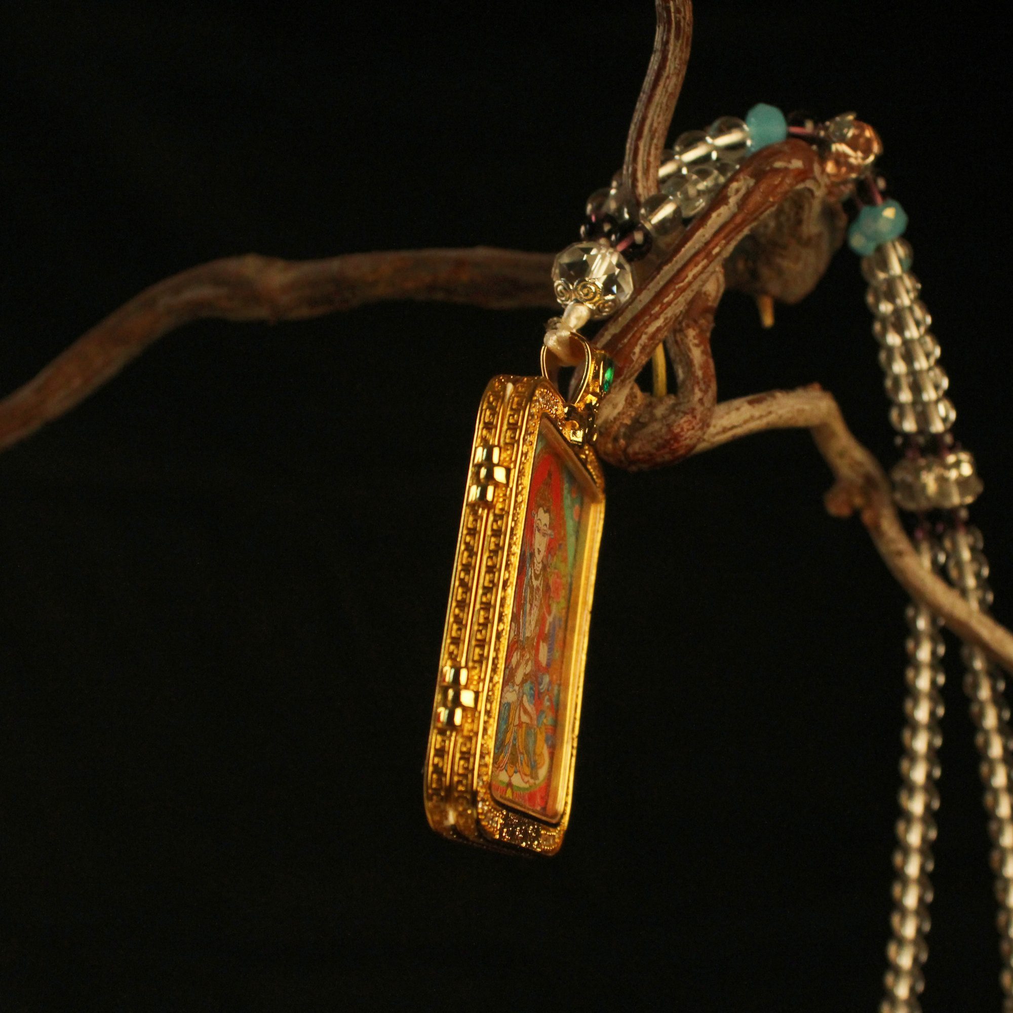 Discover the sacred art of Tibet. This exquisite hand-painted micro Thangka is encased in a luxury gold-plated crystal locket. A traditional Gau box amulet for protection, blessing, and spiritual style. Openable design to hold your intentions.