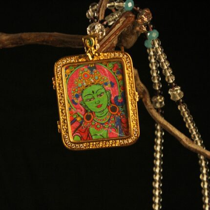 The “Divine Feminine”: Green Tara Thangka Locket | Gold & Crystal Gau Box (Goddess of Swift Action)