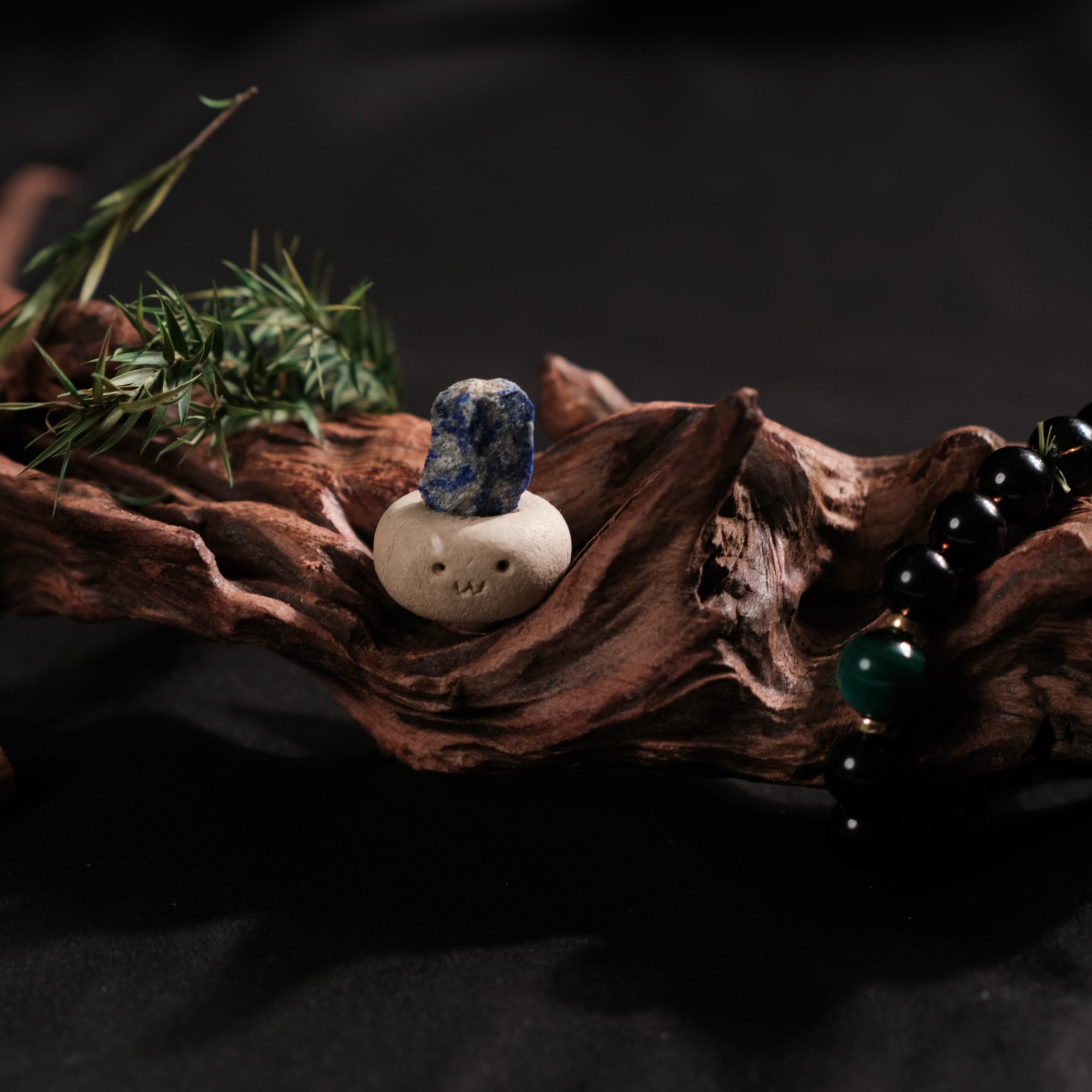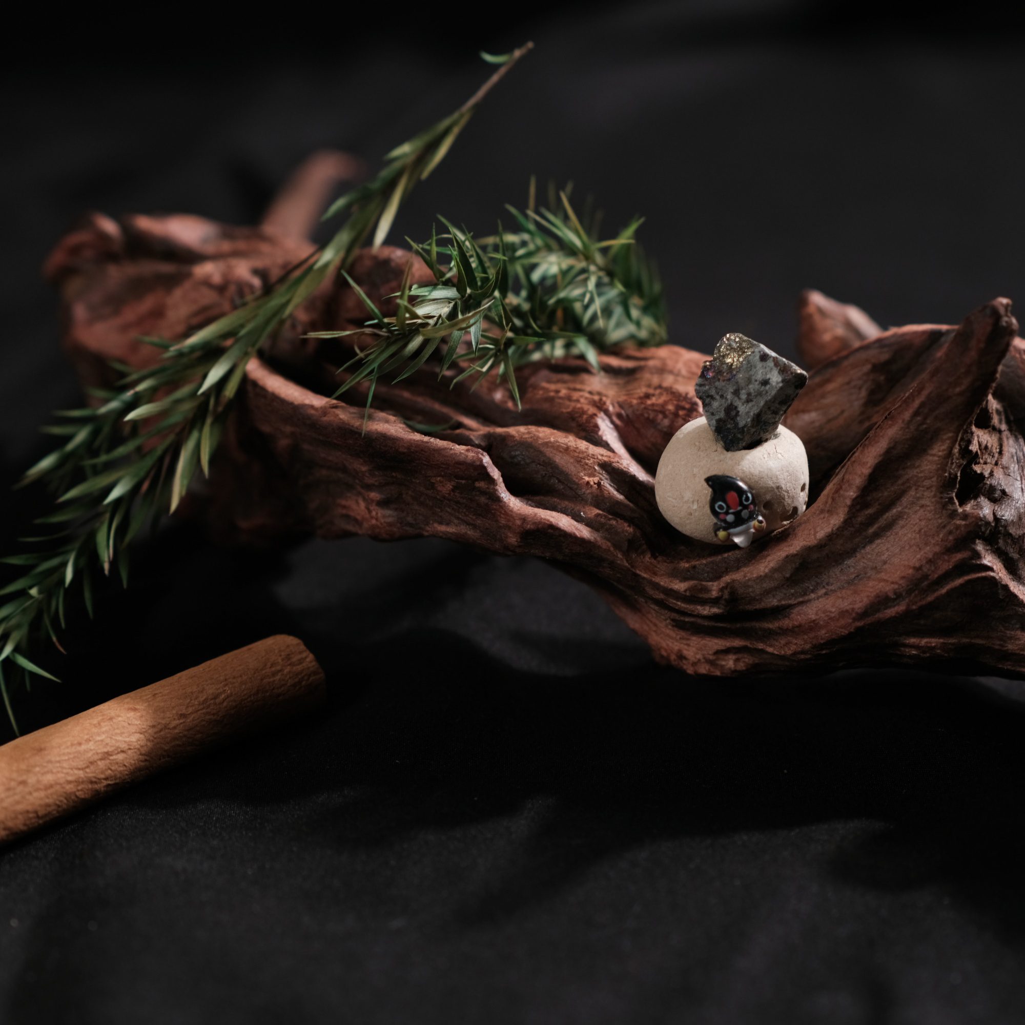Sitting atop a hand-sculpted base is a jagged chunk of Raw Pyrite (Fool's Gold) to manifest abundance. But guarding this treasure is a tiny Black Sprite/Cat, keeping a watchful eye on your success and warding off negative vibes.