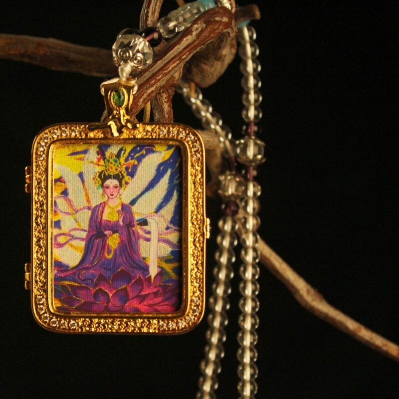 Discover the sacred art of Tibet. This exquisite hand-painted micro Thangka is encased in a luxury gold-plated crystal locket. A traditional Gau box amulet for protection, blessing, and spiritual style. Openable design to hold your intentions.