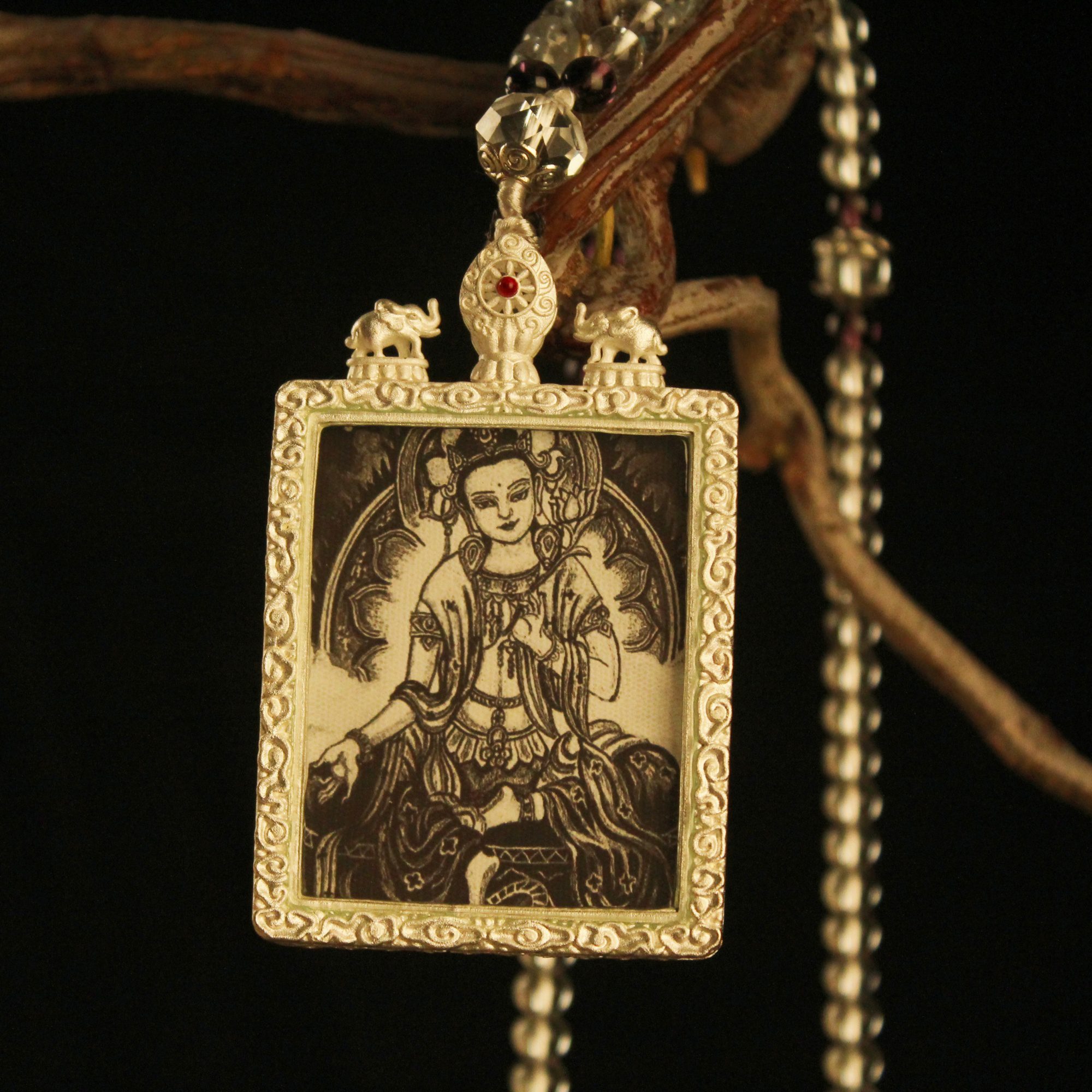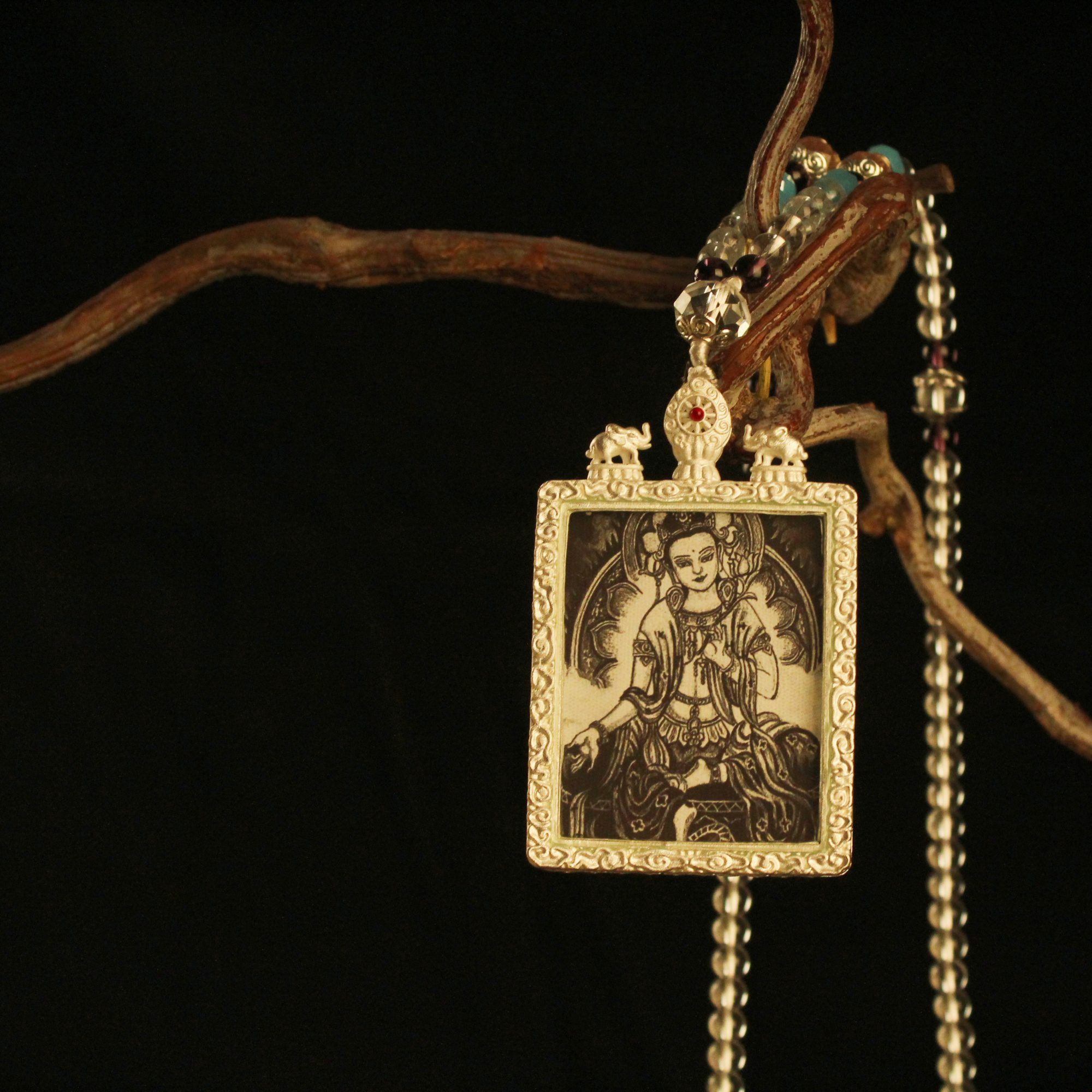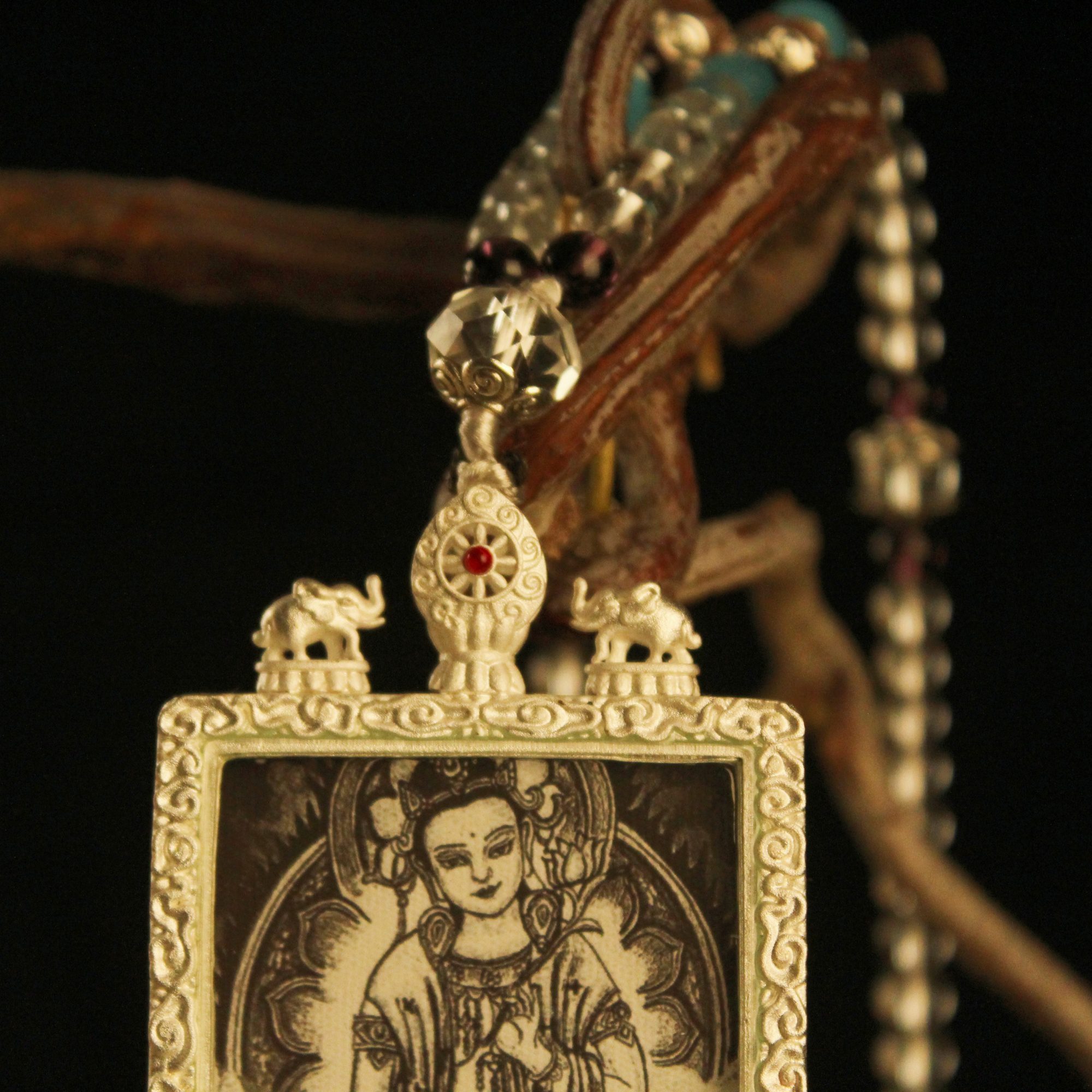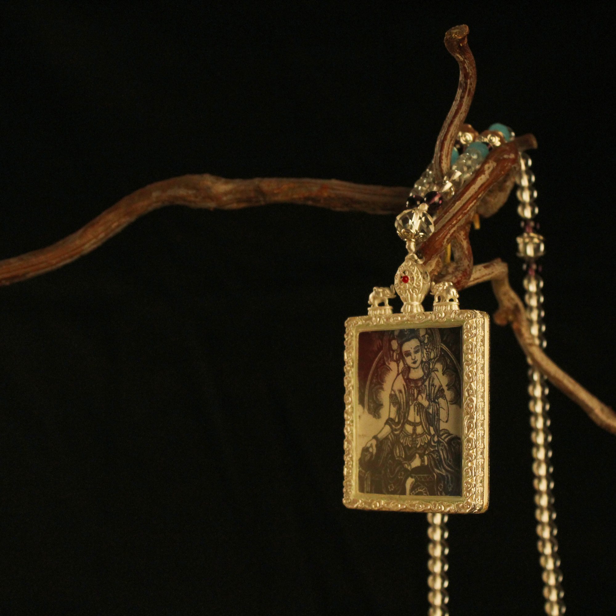 Discover the sacred art of Tibet. This exquisite hand-painted micro Thangka is encased in a luxury gold-plated crystal locket. A traditional Gau box amulet for protection, blessing, and spiritual style. Openable design to hold your intentions.