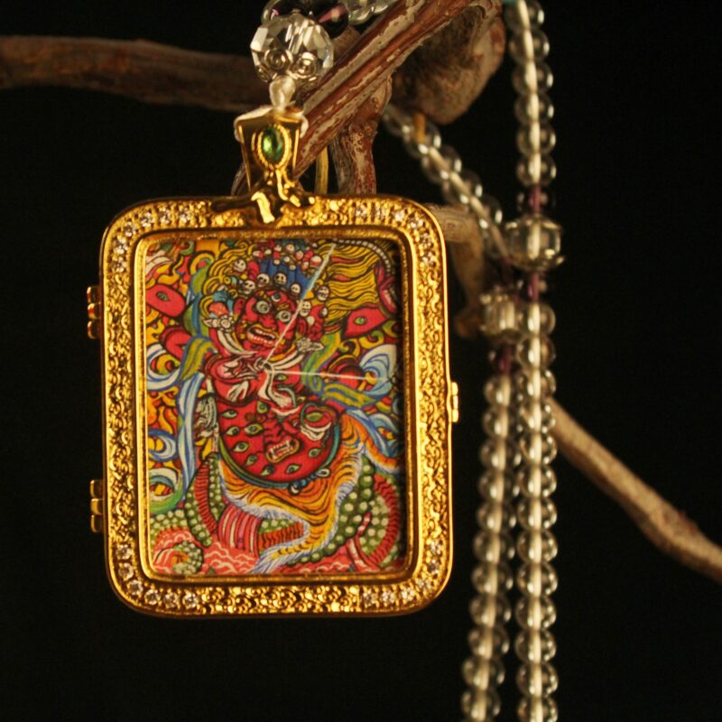 Discover the sacred art of Tibet. This exquisite hand-painted micro Thangka is encased in a luxury gold-plated crystal locket. A traditional Gau box amulet for protection, blessing, and spiritual style. Openable design to hold your intentions.