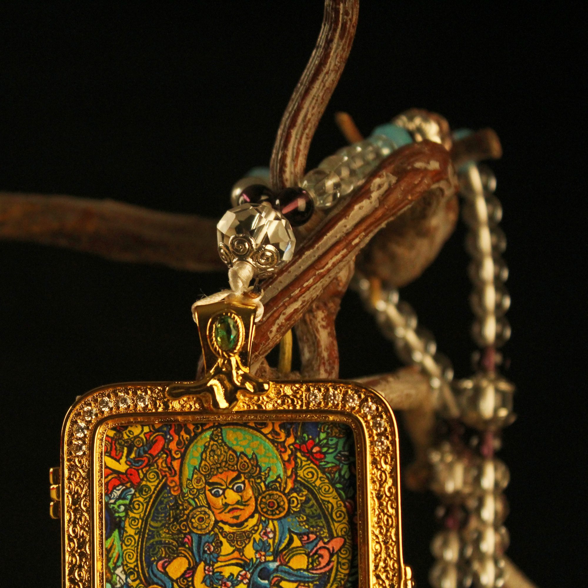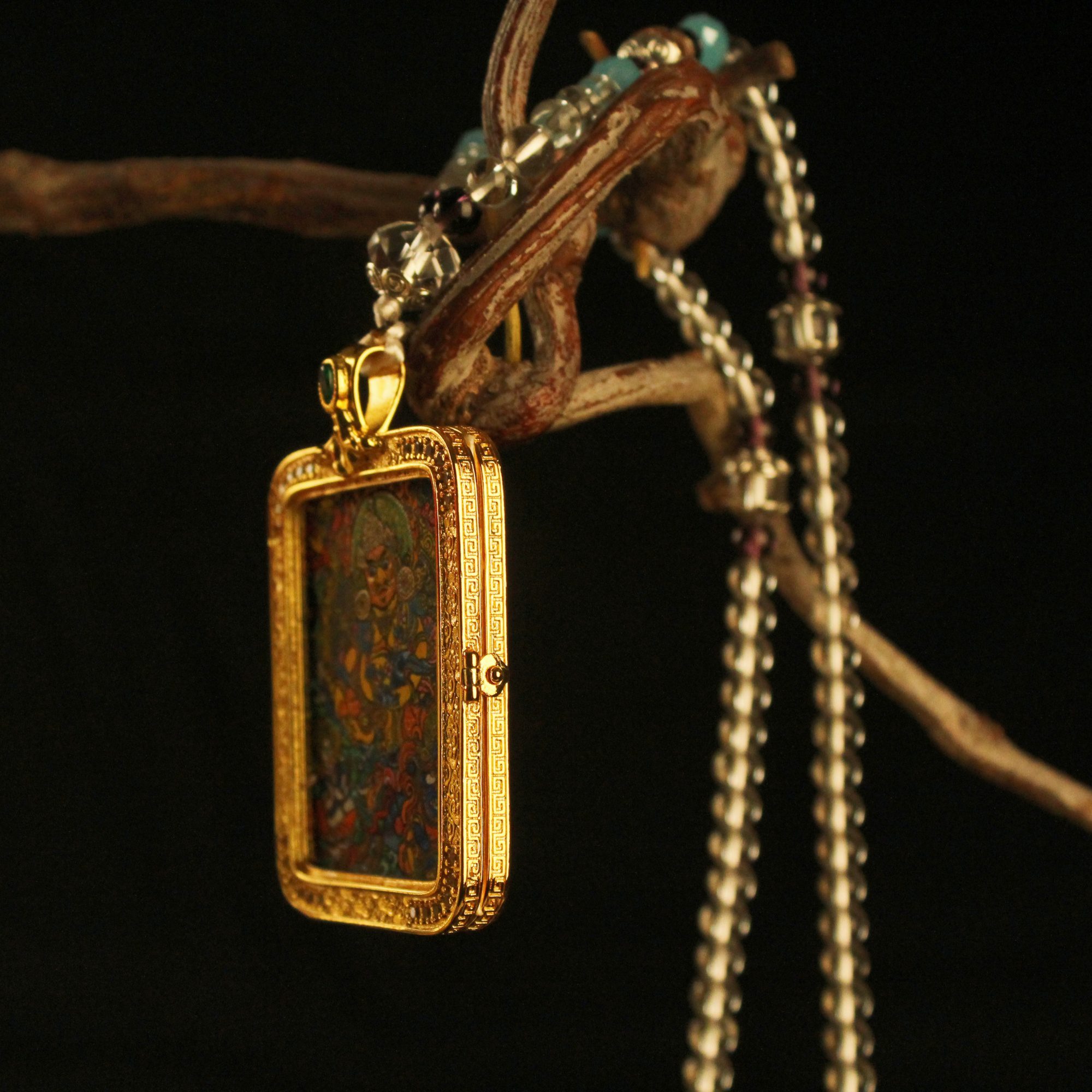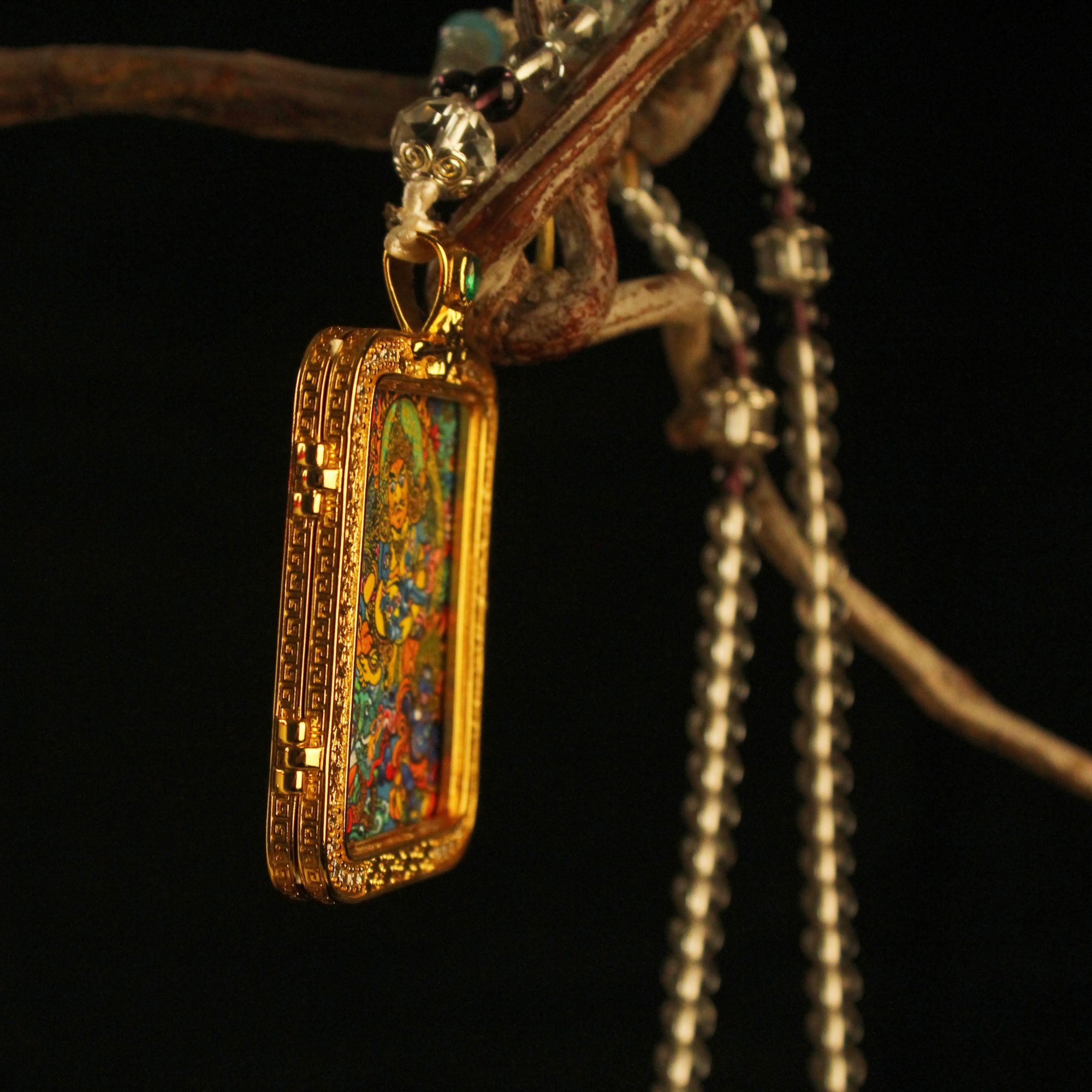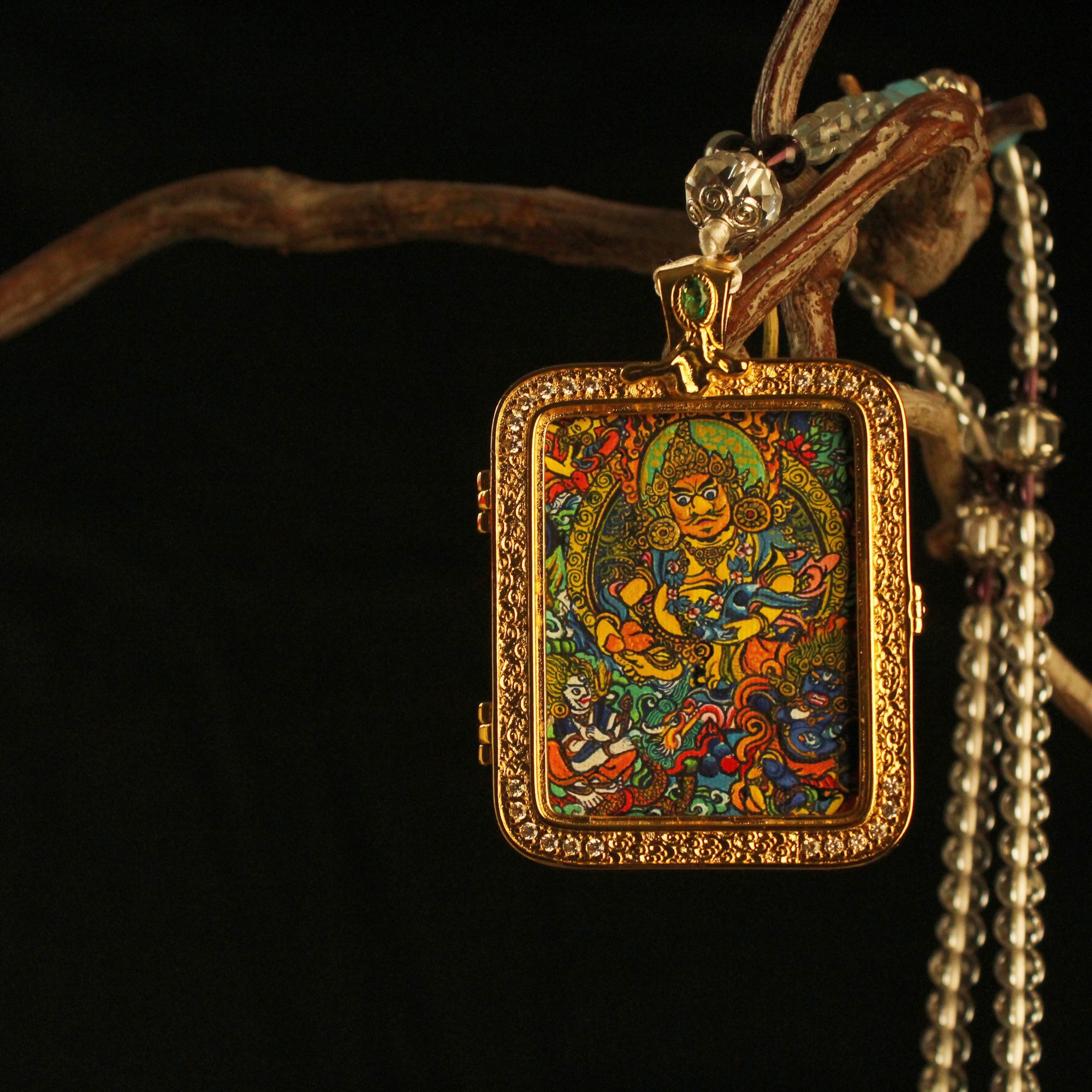 Discover the sacred art of Tibet. This exquisite hand-painted micro Thangka is encased in a luxury gold-plated crystal locket. A traditional Gau box amulet for protection, blessing, and spiritual style. Openable design to hold your intentions.
