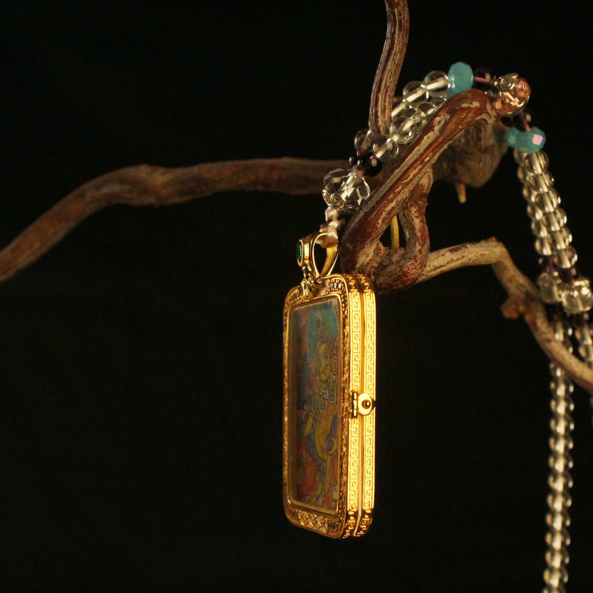 Discover the sacred art of Tibet. This exquisite hand-painted micro Thangka is encased in a luxury gold-plated crystal locket. A traditional Gau box amulet for protection, blessing, and spiritual style. Openable design to hold your intentions.